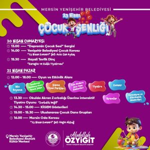 Mersin Yenişehir Belediyesi, 23 Nisan Ulusal Egemenlik ve Çocuk Bayramı nedeniyle çocuklar için birbirinden renkli kutlama programı hazırladı. 20-21 Nisan tarihlerinde Yenişehir Belediyesi Kültür Merkezi çocukların buluşma noktası olacak, eğlenceli etkinliklerle bayramın coşkusu birlikte yaşanacak. Yenişehir Belediye Başkanı Abdullah Özyiğit de tüm çocukları etkinliklere davet etti.