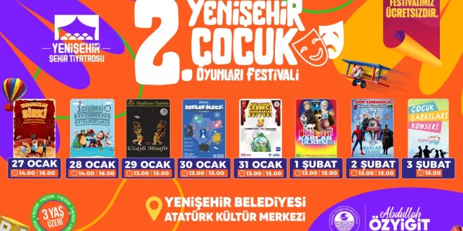 Eğlenceli karakterler, renkli kostümler ve büyülü atmosferleriyle birbirinden güzel 8 tiyatro oyunuyla Yenişehir Belediyesi, tatildeki çocuklara renkli anılarla eşlik edecek. Festival, 27 Ocak Cumartesi günü saat 14.00 ve 16.00’da sahnelenecek “Yaramazlar Sirki” oyunu ile başlayacak. 28 Ocak Pazar günü yine saat 14.00 ve 16.00’da “Sevimli Kahramanlar Masal Adası’nda” oyunu çocuklarla buluşacak. 29 Ocak Pazartesi günü saat 13.00 ve 15.00’te HayalicinasTiyatrosu, Hacivat ve Karagöz oyunu olan “Uzaylı Misafir”isahneleyecek.  30 Ocak Salı günü ise Yenişehir Şehir Tiyatrosu, “Kediler Ülkesi” oyununu 13.00 ve 15.00’te çocuklarla buluşturacak.