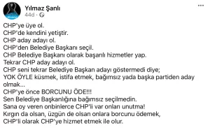 Mersin CHP önceki dönem il başkanlarından Yılmaz Şanlı yaklaşan 31 Mart yerel seçimleri öncesinde aday gösterilmeyince  partiden istifa edip bağımsız aday olacaklara ateş püskürdü.