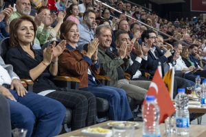 Tüm salonun 29 Ekim Cumhuriyet bayramı dolayısıyla bayraklarla donatıldığı karşılaşmayı, Mersin Büyükşehir Belediye Başkanı Vahap Seçer ve Meral Seçer de tribünden izleyerek MSK’ya destek verdiler.